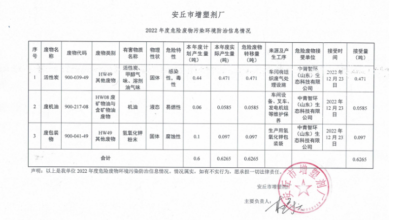 2022年度危險廢物污染環(huán)境防治信息情況公示